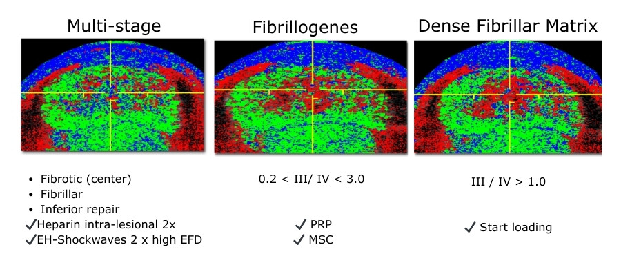 The management strategy included targeted injections and heavy shockwave therapy aimed at removing the chronic scar and improving perfusion. Once this ‘stone’ was removed, the treatment shifted to Platelet-Rich Plasma (PRP) and stem cell therapies, guided by the relative ratio of red to black on the UTC scan, which represents the density of the fibrillar matrix.