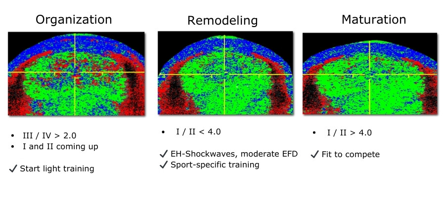 As the healing process was monitored, the increase in red and the emergence of green and blue indicated a progressing structure, prompting the initiation of loading exercises. This early intervention and structured rehabilitation, informed by UTC staging, allowed for a quicker return to training activities than typically expected.